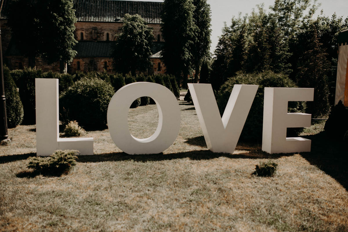 Dalej... ach, first look w krzaczorach za kościołem (słowo krzaczory zostawiam tutaj specjalnie dla Mileny). Po wstępnych oględzinach swych niecodziennych wizerunków czekaliśmy, aż goście wejdą do kościoła. Za minutę 16:00 a oni nie w kościele, nagle pieśń, ksiądz przy ołtarzu, a my nawet nie w drzwiach, ładnie. Co by było zabawniej dopadła mnie wtedy moja panika z cyklu – "nic z siebie nie wyduszę". Ponoć prawie "biegliśmy" do ołtarza, a ja dobrze pamiętam jak przed ruszeniem Paweł do mnie mówi "powoli, krok za krokiem". Byłam przekonana, że idę jak ślimak… biegłam, a kościół nieduży, to się ludzie nie napatrzyli. ;) Siedzimy już na miejscu, oddycham ledwo co, kwiaty to mają ze mną jak na fotelu z masażem. Księdza odprawiającego mszę poznaliśmy… w czasie mszy, wizytacyjnie ksiądz z Donbasu (o swojej historii wspomniał nie raz). Natomiast w czasie kazania pan organista walczył z mikrofonem. Ostatecznie mówiliśmy przysięgę bez mikrofonu, bo było jakiś zwarcie (kiedyś miałam marzenie mówić bez mikrofonu – uważajcie o czym marzycie). W czasie wesela dowiedziałam się, że to zwarcie było pode mną! Ależ moje nerwy musiały pole wyzwalać. :) Przysięga... hym... niektórzy myśleli, że płacze, inni że taka fajna jestem, bo się śmieje, a to była moja reakcja na te wszystkie dotychczasowe atrakcje tego dnia. Ale powiedziałam, uf, brawa dla mnie za sukces życia. ;) Przecież dobrze wiedziałam, że jakikolwiek stres w dym dniu jest irracjonalny, a jednak. Na szczęście po kościele cały stres sobie gdzieś poszedł. Pod kościołem goście rzucali płatkami kwiatów z przygotowanych wcześniej rożków, a ja w końcu zobaczyłam gości. Później zdjęcie grupowe i życzenia. Następnie udaliśmy się pod bramę hotelu gdzie odśpiewali nam sto lat, wznieśliśmy toast i zbiliśmy kieliszki. Nie było typowego chleba i soli, sam szampan na przywitanie. Pierwszy raz zobaczyłam udekorowany w pełni namiot... byłam w pełni zadowolona. Przy namiocie mieliśmy rozstawione fotele ratanowe, stolik z polaroidem i księgą gości, ogromne LOVE – będące też tłem do zdjęć rodzinnych. Dania w trakcie wesela były serwowane, z boku namiotu stał długi stół z zimnymi zakąskami, ciastami itd. Było to bardzo dobre rozwiązanie, jednym z plusów był estetyczny wygląd stolików. Kwiaty i dekoracje nie zniknęły pod toną surówek, ziemniaków itp. Dodatkowo bufet integrował ludzi z różnych stolików. Jak już jesteśmy przy jedzeniu, to pora na alkohol. Zdecydowaliśmy się na barmana i w przypadku naszych gości był to strzał w dziesiątkę!